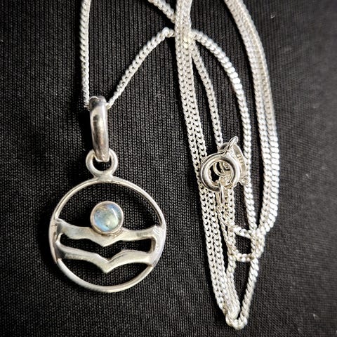 Kaulakoru 925 hopeaa, riipuksessa safiiri ja ympärillä muistaakseni zirkoniat. Nikkelitön.