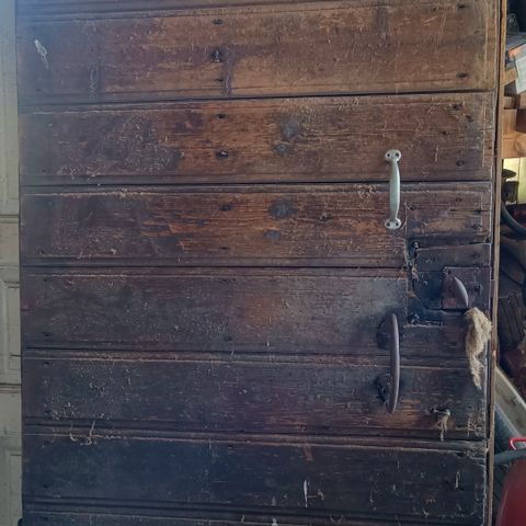 Iän vanha väliovi, purettu siirretystä hirsikehikosta. Karmiton. Korkeus 180cm, leveys 98cm, paksuus n. 3,4cm. Lukko liikkuu, avainta ei ole.