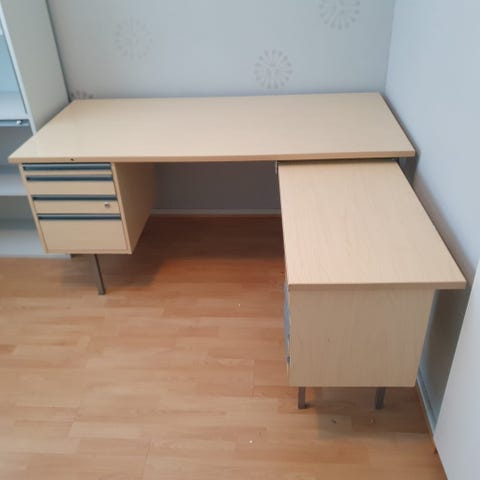 Hyvä kuntoinen kirjoituspöytä täysipuuta. Siistit pinnat joka puolelta ja pöydässä sähkö ja tietoliikenne kaapaleille valmis, siisti aukko. Nouto Reijola, Joensuu.