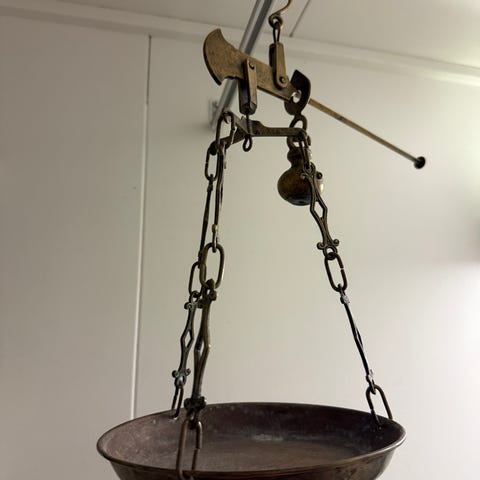 Messinkinen vaaka, tarkastusmerkintä vuodelta 1919. Mittaa 135 kg. Varren pituus 50 cm.