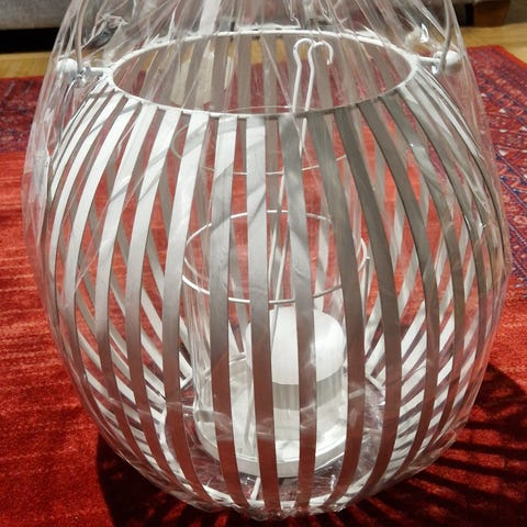 Luonnonvalkoista Pallo-lyhtyä voi pitää pöydällä tai sen voi ripustaa metallikoukulla roikkumaan. Lyhdyn koko on 24x26 cm ja se on luonnonvalkoiseksi maalattua metallia,kokonais korkeus lyhdyllä on 30 cm. Lyhdyn sisällä on kynttilää tuulelta suojaava lasiosa. Siihen sopii maksimissaan 5x5 cm kynttilä tai 7,5 cm pallokynttilä.