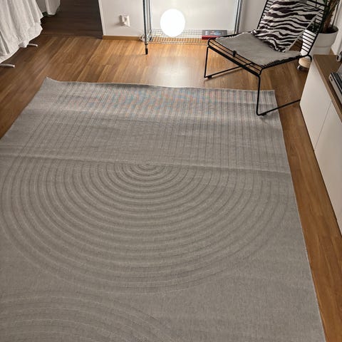 Kiiltävänukkainen, hopeaan vivahtava harmaa iso matto. Ostettu Askosta. Matto