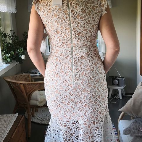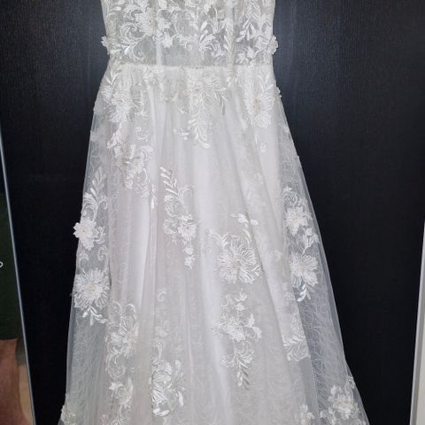 Erittäin hyvässä kunnossa oleva kahdet häät nähnyt mekko, itsellä ehti olemaan päällä vain maistraatin ajan. Kapealinjainen, 3-kerroksinen, joista päällimmäinen pitsiä. Takaa hieman pidempi. Takana nyöritys, joten sopinee noin 36-44 kokoiselle. Itse käytän kokoa 38-40. Lyhennetty 163 senttiselle, jolla 5,5 cm korot. Väri Ivory, pukupussi mukaan. Sovitus Turussa onnistuu, postikulut lähettäjälle.
