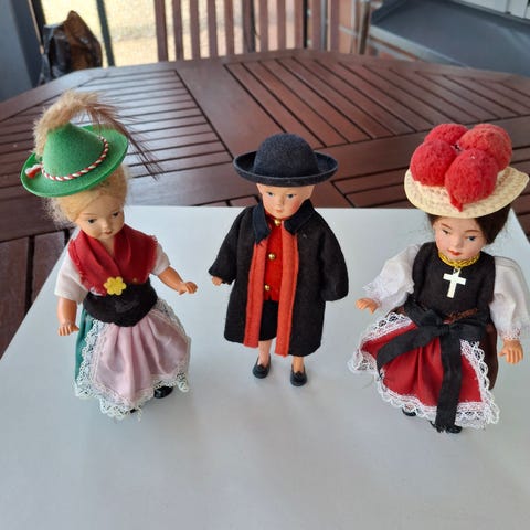 Nukke joka kiinnitetty telineeseen, "kova" pää ja kädet, korkeus n. 40 cm