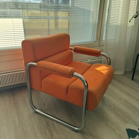Ingmar Rellingin suunnittelema malli Siesta. Tuotanto Westnofa furniture, made in Norway. Malli julkaistiin 1964 jolloin voitti korkeimman palkinnon ja Norjan huonekaluteollisuus alkoi saada jalansijaa ulkomailla. Tämä tuoli hankittu 25 vuotta sitten ja on edelleen loistavassa kunnossa ja erittäin mukava istua. Runko on kunnossa ja myös nahka hyväkuntoinen. Käytetyt liikkuvat maailmalla n. 1250 €/kpl , tämä myydään alle 1/5 hinnan. Tuoleja löytyy 4 kpl. Hinta 250€/kpl
