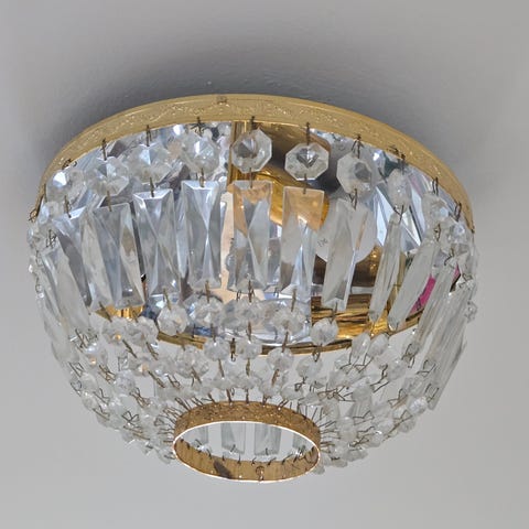 Hyväkuntoinen riippuvalaisin. Päällä kohdat neljää tuikkua varten.