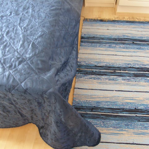 Räsymaton koko 152 x 84 cm.. Matto on napakka pysyy hyvin paikoillaan. Matto on värisävylrtään vaalea sini-keltainen. Juuri pesty.