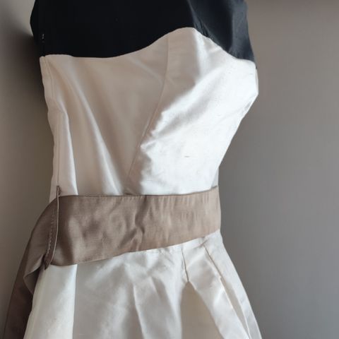 Valkoinen lyhyt mekko, musta vyökaitale, röyhelöhelma.
