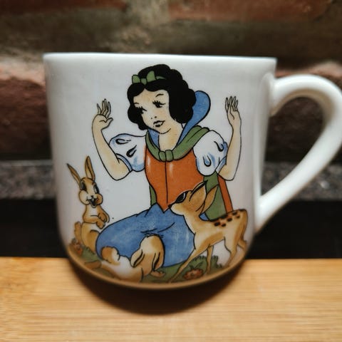Ehjä Arabian Lumikki muki piippuleimalla, sisäpuolella haalea hiusviiva, muutoin kuvat selkeät eikä juurikaan kuluneisuutta korkeus noin 8.5cm