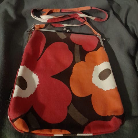 Uusi , lappu kiinni oleva , käyttämätön Marimekko Roosa mini ruutu-unikko kukkarolaukku. Sinisävyinen pikkulaukku. Irrotettava olkahihna. Mitat noin 17 x 17 cm.