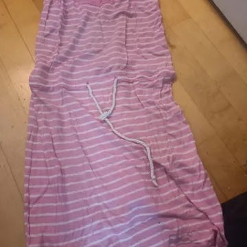 Äitiysmekko koko S. Tukuisaa puuvillakangasta. Edessä laskokset vauvavatsaa varten. Takana vetoketju ja helmassa halkio.