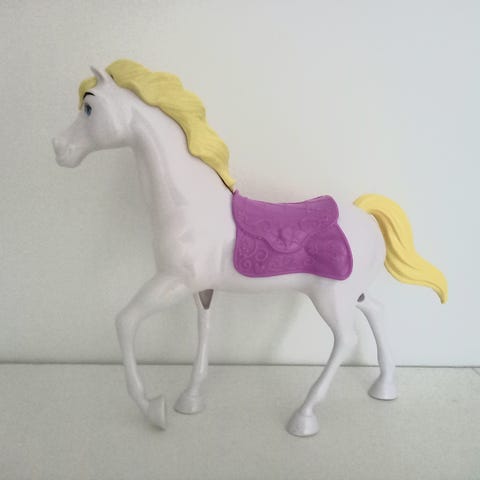 Kaunis vaalea muovinen leikkihevonen. Sopii hyvin lasten leikkeihin. Korkeus noin 31 cm. Pientä käytön jälkeä.