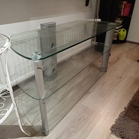 Siisti TV-taso, jonka alaosaan saa lasioven taakse pelikoneet ym. oheislaitteet.