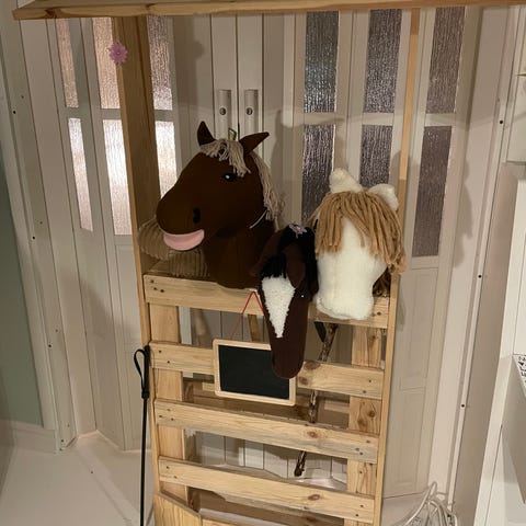 Teline on melko tukeva, mutta esim. 2-3-luokkalainen siirtää sitä helposti leikkien mukaan paikasta toiseen. Kuvien keppihevoset eivät kuulu kauppaan.