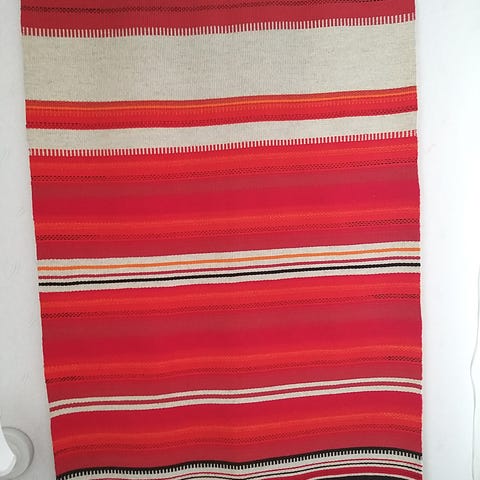 Väritykseltään puna/ruskea/oranssi raanu. Värit edelleen kirkkaat ja kuosinsa hyvin pitänyt. Leveys 85 cm ja korkeus 150 cm. Tanko sekä ylhäällä että alhaalla.