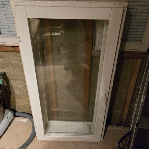 -90 -luvun alusta olevia kolmekerroksisia puisia ikkunoita ja 2 ulko-ovea(korkeus karmeineen noin 210cm, yksi lasilla leveys noin 100 karmeineen ja 1 umpiovi leveys noin 90cm). Pölyisiä ja vanhat uretaanit karmeissa, karmien paksuus 145mm. Kulumaa maalipinnoissa mutta käyttökelpoisia. Ikkunoiden mittoja leveys*korkeus: 1kpl kolmerivinen ikkuna 180*140cm, 3kpl kaksirivinen ikkuna 120*140cm, 2kpl matalia ja leveitä 180*80cm, 6kpl pikkuikkunoita kahdella ruudulla 60*100cm + 3kpl kolmella ruudulla(nämä mittaamatta). Yhdestä ikkunasta yksi ruutu rikki.