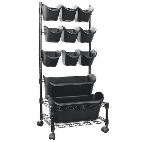 Tämä Nature siirrettävä pystysuuntainen puutarhan kukkapenkkisarja sisältää yhdeksän neliönmuotoista kukkaruukkua (0,9 l kukin) ja kaksi isoa suorakulmion muotoista istutuskaukaloa (5,4 l kukin), sekä rullapyörillä varustetun metallikehikon.