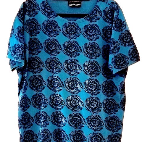 Myydään musta Marimekon T-paita L, Mika Piirainen suunn. Paidassa lyhyt hiha, ei varsinaista hihakappaletta. Pitämätön (ei mahdu päälle). Pit. 65cm, ymp.kainalon alta 84cm. Hinta 40 eur