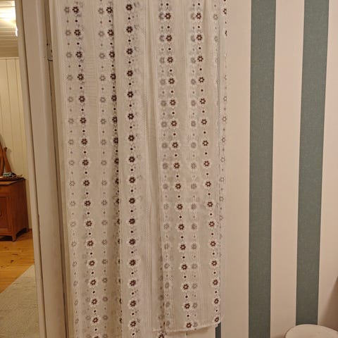 Kalastajalangasta virkatut verhot - kaksi sivuverhoa ja kappa. Verhot pestyt, ei silitetyt. Silittämällä ja prässäämällä saa lisää pituutta ja leveyttä. Sivuverhot leveys 47 - 60 cm, pituus 106 cm; kappa 27 cm korkea, leveys 140 cm.