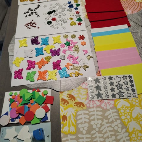 Askarteluun kaikkea pientä, tarroja, huopa kuviot, piippurasseja, 2 Kuvio sakset, 2 kuvio laite, vaahtomuovi ruusut, pikku sydämet puuta. H.kaikille 5e