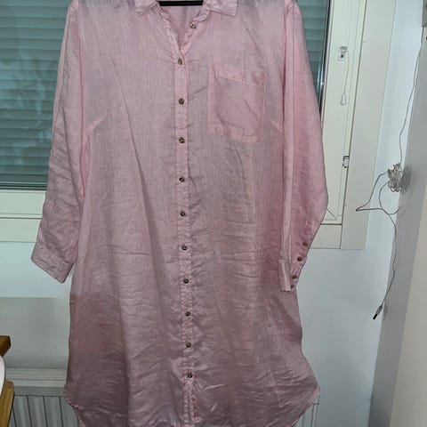 Kukikas pellavamekko, jossa valkoinen vuori.