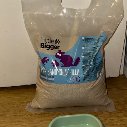 Myynnissä hyväkuntoinen ja ehjä chinchillan käytössä ollut muovinen kylpyastia sekä 1 kg Carrera kylpyhiekkaa.