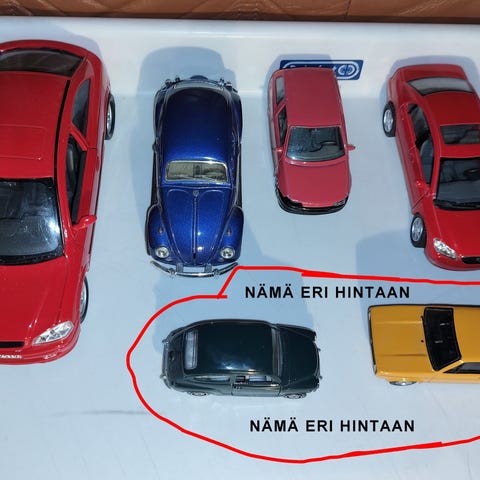 Toimivat pienoismallit. Olleet kirjahyllyssä koriste esineinä. Toimivat moottorit eli vedetään taakse ja päästetään irti jolloin auto säntää eteenpäin. Halutessaan näillä voisi pitää vaikka leikkimielisen kisan. Hinta 10€ kpl.