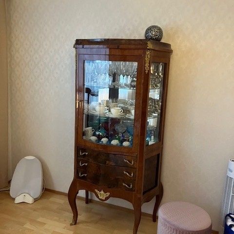 Lähinnä Empire-tyyliä (koristeellinen kuin rokokoo) oleva ulkomailta vuosikymmeniä sitten tuotu upea vintage vitriini / hylly, jalopuuta. Pronssilyötteet. Kerrassaan kaunis yksilö. Vintage kaunotar. Takana peili, joka moninkertaistaa kristalliesi ja hopean välkkeen, tietysti myös esim. lempikäsilaukut tms. voi laittaa tähän vaihtoehtoisesti esille. Tarjoa.
