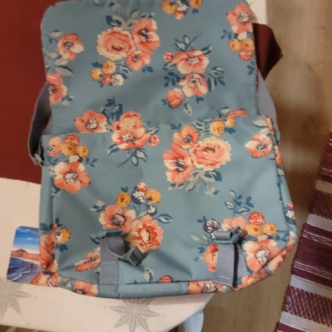 Olalla pidettävä. Ulkona sivutasku. Mitat: leveys 48 cm, korkeus 33 cm, syvyys 16 cm.