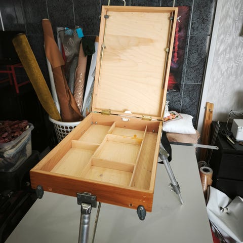 Kätevä tarjotin esim vuodepotilaalle. Kätevä maalausteline vaikkapa sylissä. Leveys 51 cm, syvyys 32 cm, jalkojen korkeus pöydän alta 20 cm.