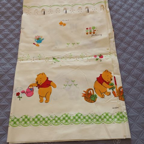 Verholiikkeen ompelema Nalle Puh yläverho, kellomuotoon ommeltu eli ei suorakaide. Laskeutuu nätisti. Puhdas ja ehjä, silitystä vaille valmis ikkunaan.
