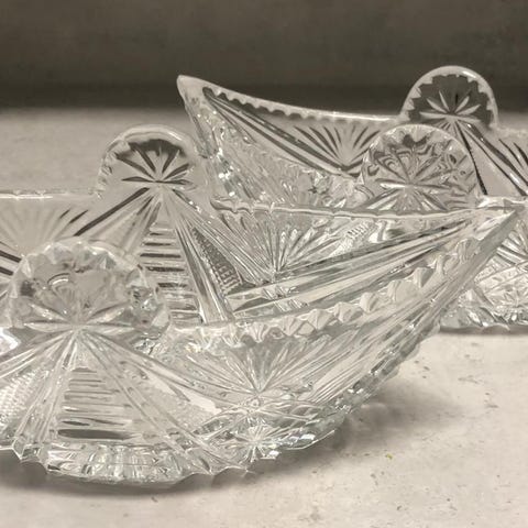 Uudenveroinen kolmijalkainen kristallimalja/kastemalja