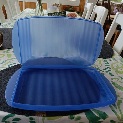 Tupperwaren matala pyöreä säilytysrasia. Halkaisija n. 22 cm, korkeus kannen kanssa n. 2 cm. Kannessa pientä käytön jälkeä (kuva), muuten erittäin hyvässä kunnossa.