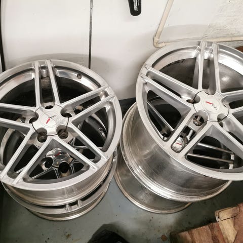 Kuvien mukaiset corvette vanteet. Speksit näkyy kuvissa. Todella likaiset ja vanteiden sisäpuolet varsinkin hapettuneet. Pintapuolista saa varmasti ihan ok siistit kunnon pesulla.