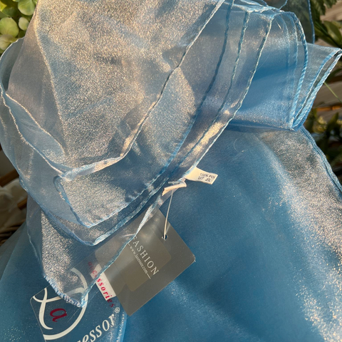 Huivi on ohutta ja läpikuultavaa materiaalia ja on tarpeeksi iso pysyäkseen vaivattomasti hartioilla, mutta voit sitoa sen myös kaulaan tai olkainten alle tehden huivista hihat pukuusi.