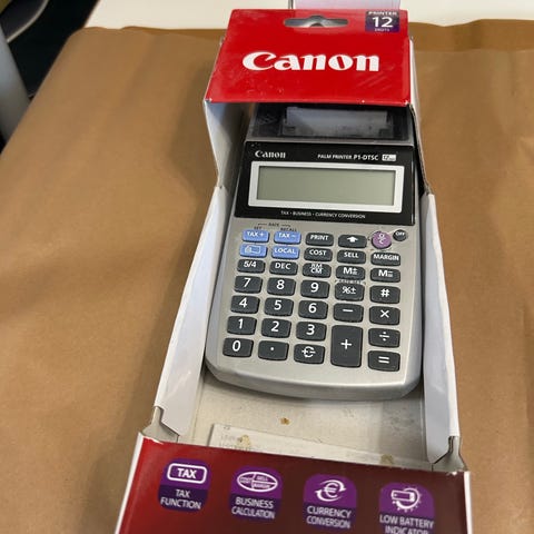 Hieman vanhempi siistikuntoinen nauhalaskin. Sopivaa kuittipaperia ei ole testaukseen. En tiedä sanoa muuta kuin että virrat menee päälle normaalisti.