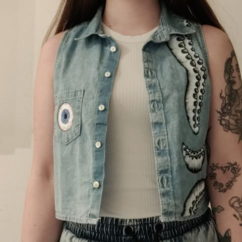 Ihana liivi keijuiluun, rockailuun tai nepalimeininkiin. Kokomerkintää ei ole, on edestä solmittava, sopii noin koko M, ei kovin isorintaiselle (tai tietysti voi käyttää vaikkei menisi ihan edestä yhteen).