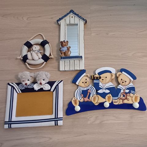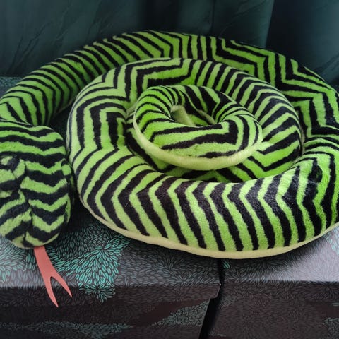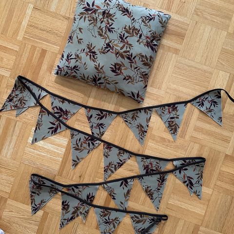 Kaikon kankaasta ommeltu käärme (pidetty sängyn reunapehmusteena), viirinauha ja koristetyyny.