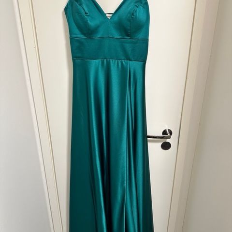 Petroolinsininen tai smaragdinvihreä kaunis iltapuku. Voi pitää olkaimettomana. Itse ompelin mukana tulleet olkaimet kiinni. Pukuun kuuluu myös samanvärinen huivi. Sivussa strassi. Voin lisätä kuvia myöhemmin.