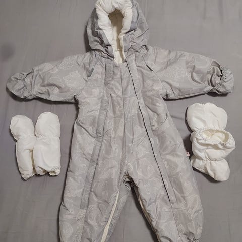 Äitiyspakauksen toppapuku koko 68-74cm. Paljon käytetty, mutta edelleen ehjä. Pesty hajusteettommasti. Vanu ohentunut, joten juuri sopivan lämmin syksyn ja kevään viileillä keleillä.