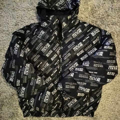 Versace pikkutakki. Kankaassa pienen pieni reikä, joka näkyy viimeisessä kuvassa. Kunnossa ei muita moitteita. Laadukas ja tyylikäs.