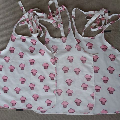 Itsetehdyt lasten essut. Siistit lasten essut. Käytetty askartelu/maalaushommissa suojaamaan vaatteita. Toisesta löysin pienen tahran mutta on tosi siistit, lähes uuden veroiset. Koko on sopiva alle kouluikäiselle.