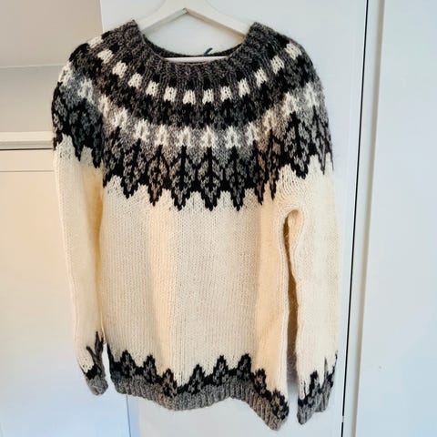 Käsinneulottu islantilaisvillapaita perinteisellä kuviolla, koko L. Värit tummanharmaa, luonnonvalkoinen ja vaalea beige. Aidosta islantilaisesta loppi-villasta valmistettu paita on lämmin, hengittävä ja vettä hylkivä – täydellinen syksyn ja talven ulkoiluun tai vaikka mökille.