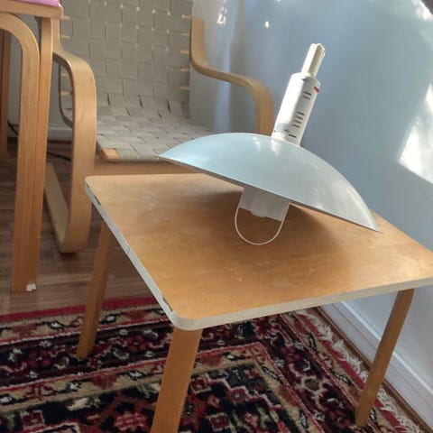 Hissi toimii ja tulppa mukana. Katkaisija varjostimen päällä, mukana punainen, valkoinen ja musta vaihdettava reunus. Varjostimessa ei kulumaa, muovit hieman kellastuneet ja muu näkyy kuvista.