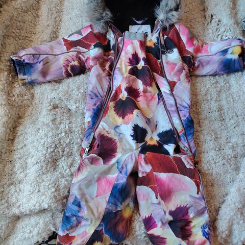Vaaleanlila Molon toppahaalari, koko 92 cm. Polvissa ja pepussa jonkun verran jo karheumaa, heijastimissa myös kulumaa. Ei reikiä. Ykköshaalarina en enää pitäisi, mutta rymyhaalarina mielestäni menee vielä.