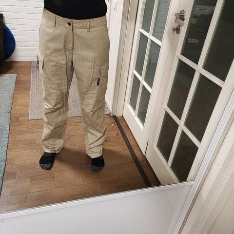 Tuotteen lappu ilmoittaa kooksi XL ja tämä lienee lasten koko. Menee S-koon aikuiselle (175 cm pitkäjalkaiselle lahje jää lyhyeksi) Vyötärönleveys 39 cm, lahkeen sisämitta 67 cm. Lahkeessa likaa, mutta lähtee todennäköisesti pesulla.