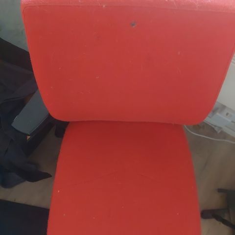 Tuolin keinonahka vähän rispaantunut kulmista (lähinnä vasemmalta puolelta, ylhäältä selkänojasta, kuva), mutta yleisilme on kuitenkin siisti. Tuolissa istuu ryhdikkäästi ja se tukee varsinkin ristiselkää hyvin. Pyörät rullaavat moitteetta ja korkeudensäätö pelaa. Ollut lukiolaisen tuolina, ei enää tarvetta.
