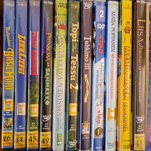 Lasten vanhoja DVD -levyjä. Olleet vuosia varastossa. Myydään yksittäin tai pakettina.
