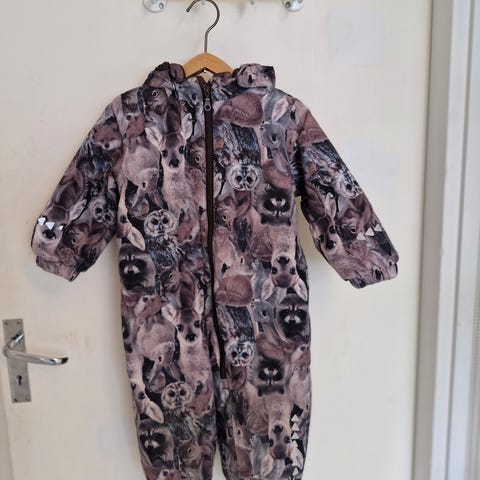 Guppyn lämmin ja paksu fleecevuorinen talvihaalari. Pientä kuluman jälkeä polvissa, hihansuissa ja takapuolella. Ei reikiä. Museotarrasta jäänyt haalea rinkula haalarin etuosaan(näkyy kuvassa) en ole yrittänyt poistaa.