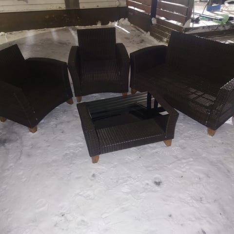 Rottinki kalusto, pöytä ja kaksi tuolia, nyt syyshitaan.